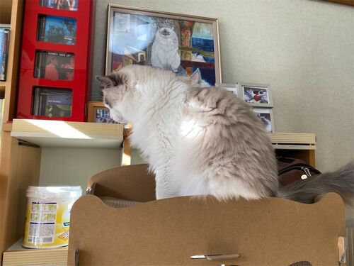 今朝もダンボールハウスで身づくろい 今朝も6時過ぎくらいからふくちゃんは起こしに来てくれました。僕は7時くらいに起床。ふくちゃんはちょうど僕の部屋に入ってきていて、廊下まで移動してころりんと倒れました。 ショウタワーを経由して ねらいを定めて …